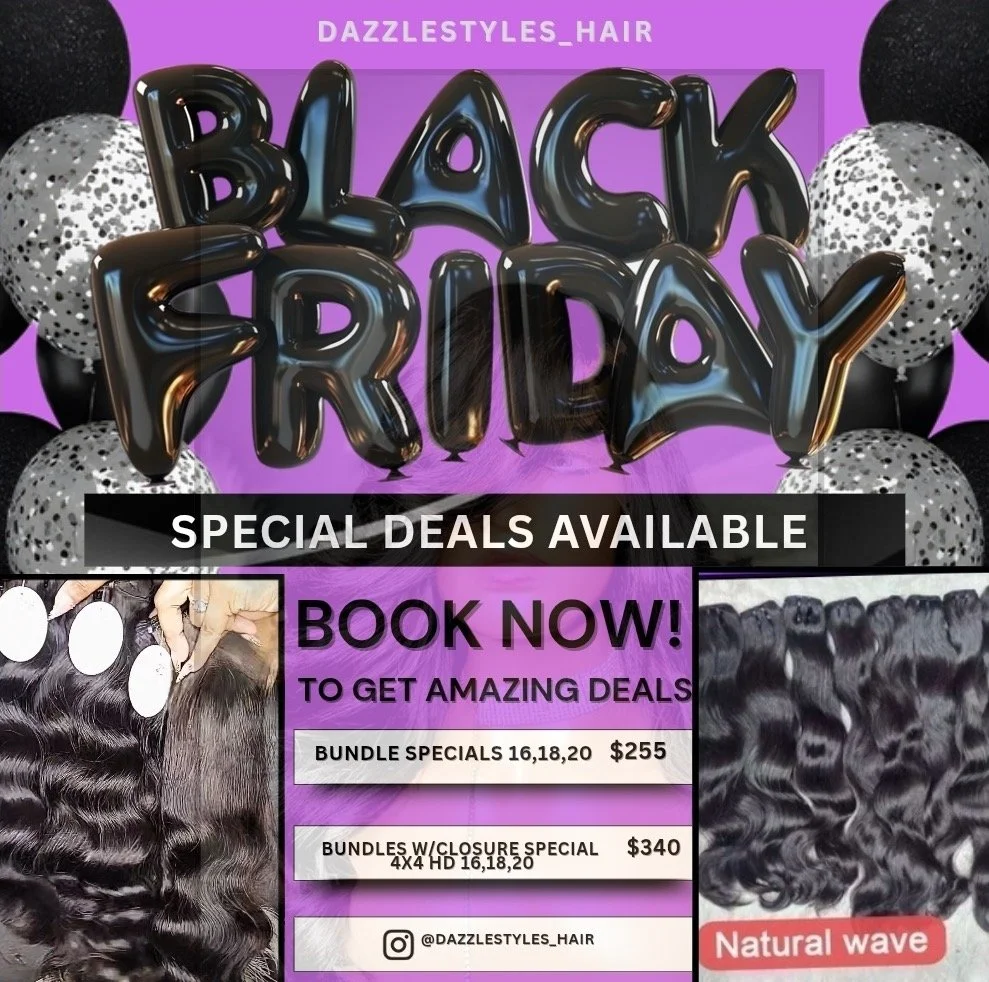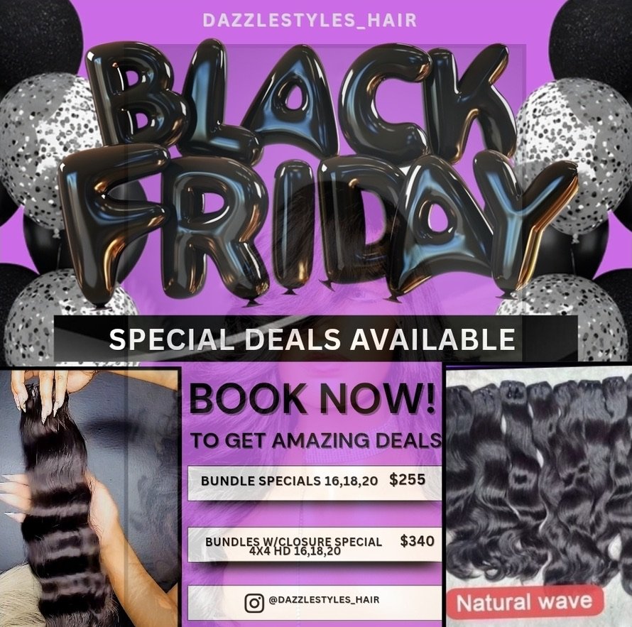 BLACK FRIDAY SPECIAL Categories: All BLACK FRIDAY SPECIAL Dazzle Caps Wigs Bundles All / BLACK FRIDAY BUNDLE + CLOSURE DEAL $340.00 BLACK FRIDAY BUNDLE DEAL $255.00